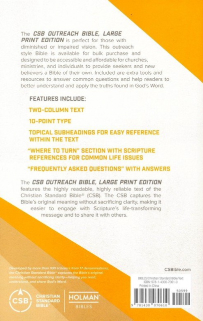 The CSB Outreach Bible, Large Print Edition features the highly readable, highly reliable text of the Christian Standard Bible® (CSB). The CSB stays as literal as possible to the Bible's original meaning without sacrificing clarity, making it easier to engage with Scripture's life-transforming message and to share it with others.