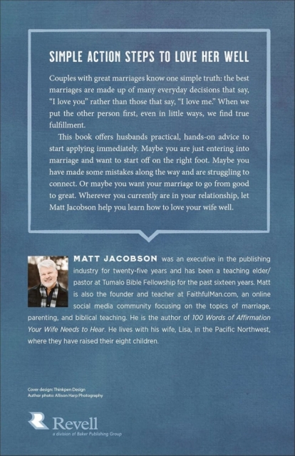 This book offers husbands powerful, practical, hands-on advice to start applying immediately. Maybe you are just entering into marriage and want to start off on the right foot. Maybe you have made some mistakes along the way and are struggling to connect. Or maybe you want your marriage to go from good to great. Wherever you currently are in your relationship, let Matt Jacobson help you learn how to love your wife well.