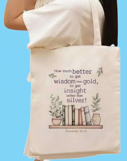 Embrace true treasure with this beautifully crafted canvas bag. Featuring the inspiring scripture verse from Proverbs 16:16: “How much better to get wisdom than gold, to get insight rather than silver.” This verse serves as a daily reminder of the incomparable value of God’s wisdom over worldly riches.